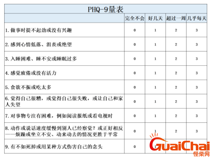 大家一定一定要重视身心健康。可以通过抑郁症测评表——PHQ-9量表来测试自己是否存在抑郁症风险,这是来自美国哥伦比亚大学的专业测试量表,虽然只有简单9道题,但它筛查抑郁症的敏感性达到了88%。