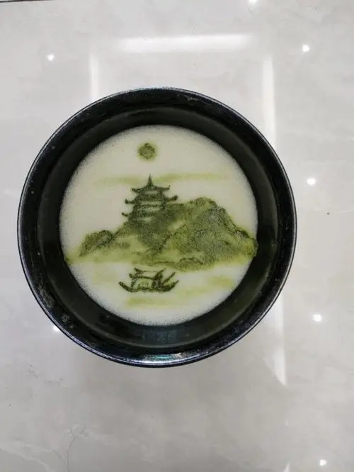 最后再用工具蘸取之前调好的抹茶浓浆,在泡沫上作画,这便算大功告成。