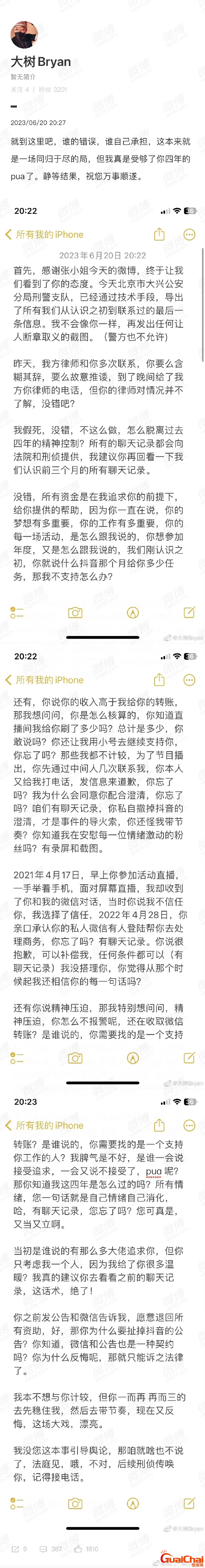 上一次怪柴网小编写到《喜欢你,我也是》恋综嘉宾张小狮、潘明俊翻车人设大揭秘,其中有写到张小狮能让一个前脚喊打喊杀锤的体无完肤的男人一夜之间变成了一只小老鼠,居然翻盘了。万万没想到6月6日发布的资助声明,6月20日又迎来反转。发布的内容涉及假死、造黄谣、PUA等可谓是精彩绝伦,而且双方各执一词,真是不去当演员可惜了呀!下面和小编一起来看看张小狮和榜一大哥大树最新后续!